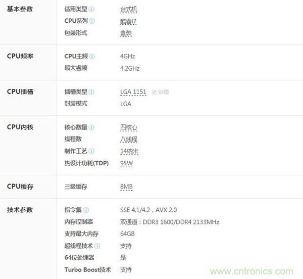 CPU一般由三部分組成:邏輯運算單元、控制單元和存儲單元組成。我們看一下Intel i7 6700k具體參數(shù):