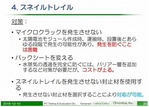 例如,試制新的封裝材料和背板時,除了要驗證的零部件以外,還要制作利用現有產品構成的太陽能電池板,在電池板上再現蝸牛紋產生的條件。對材料廠商來說,無論是制作這種驗證用電池板,還是再現引發蝸牛紋的條件都比較困難。