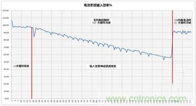 圖1中,關閉主動均衡控制的160次循環測試中,前20次的輸入效率保持在95%以上,一個非常平穩的輸入效率,這就是“首20次循環現象”;在20次以后的測試中,電池系統的輸入效率隨充放電次數下降(充電和放電條件不變),在第40次時,約為90%,在第70次時,約為80%,在100次時,已經降到70%,而在第160次時,約為55%。