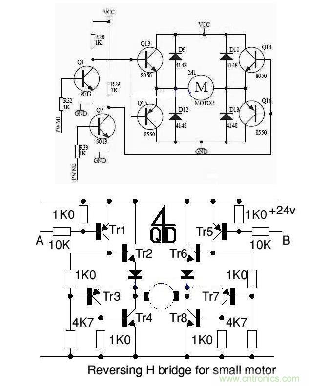 驅動電機時,保證H橋上兩個同側的三極管不會同時導通非常重要。如果三極管Q1和Q2同時導通,那么電流就會從正極穿過兩個三極管直接回到負極。此時,電路中除了三極管外沒有其他任何負載,因此電路上的電流就可能達到最大值(該電流僅受電源性能限制),甚至燒壞三極管。基于上述原因,在實際驅動電路中通常要用硬件電路方便地控制三極管的開關