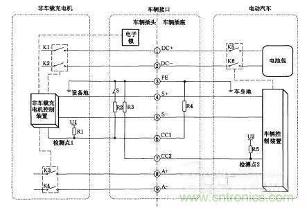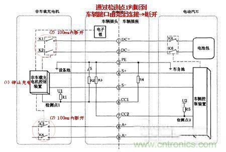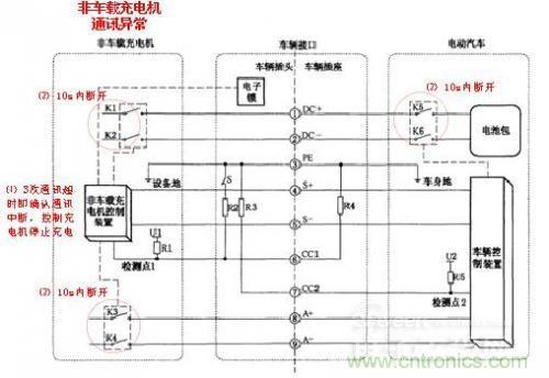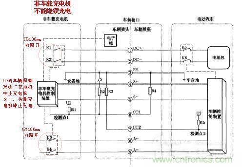 2)在充電過程中,非車載充電機控制裝置通過對檢測點1的電壓進行檢測,如果判斷車輛接口由完全連接變為斷開(如車輛意外移動、充電槍線纜被意外擾動等),則控制非車載充電機停止充電,應在100ms內斷開K1、K2、K3、K4。