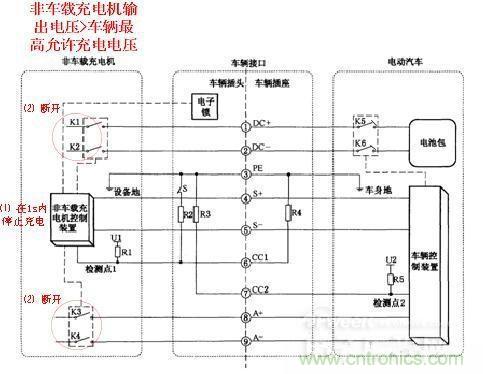 1)在充電過程中,非車載充電機控制裝置通過對檢測點1的電壓進行檢測,如果判斷開關S由閉合變為斷開(如充電槍上按鍵失靈或誤觸發等),應在50ms內將輸出電流降至5A或以下;