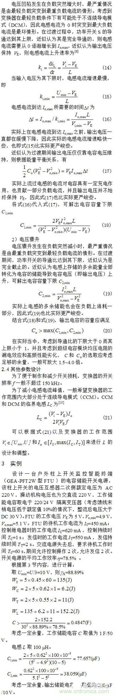 根據(jù)能量平衡關(guān)系,分析了負(fù)載突然增大和負(fù)載突然減輕情況下的最嚴(yán)重電壓凹陷和電壓驟升,并得出輸出濾波電容容量的設(shè)計(jì)考慮。以一個(gè)具體的電容儲能FTU電源為例,詳細(xì)說明了電路參數(shù)的設(shè)計(jì)方法,并進(jìn)行了實(shí)驗(yàn)研究。實(shí)驗(yàn)結(jié)果表明所設(shè)計(jì)的電容儲能備用電源能夠滿足在失去正常供電電源后自動化終端待機(jī)、操作和通信的需要,并且所進(jìn)行的理論分析與實(shí)際情況相符。