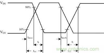 MOS管的損耗由開(kāi)關(guān)損耗和驅(qū)動(dòng)損耗組成,如圖1所示:開(kāi)通延遲時(shí)間td(on)、上升時(shí)間tr、關(guān)斷延遲時(shí)間td(off)、下降時(shí)間tf。
