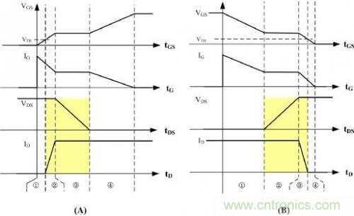 開(kāi)關(guān)導(dǎo)通時(shí)對(duì)應(yīng)的波形圖如圖2(A),開(kāi)關(guān)截止時(shí)對(duì)應(yīng)的波形圖如圖2(B),可以看到開(kāi)關(guān)管每次導(dǎo)通、截止時(shí)開(kāi)關(guān)管VDS電壓和流過(guò)開(kāi)關(guān)管的電流ID存在交疊的時(shí)間(圖中黃色陰影位置),從而造成損耗P1,那么在開(kāi)關(guān)頻率fs工作狀態(tài)下總損耗PS= P1 *fs,即開(kāi)關(guān)頻率提高時(shí),開(kāi)關(guān)導(dǎo)通與截止的次數(shù)越多,損耗也越大。