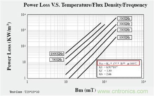 如圖4所示,變壓器鐵損是和開(kāi)關(guān)頻率的kf次方成正比,又與磁性溫度的限制有關(guān),所以隨著開(kāi)關(guān)頻率的提高,高頻電流在線(xiàn)圈中流通產(chǎn)生嚴(yán)重的高頻效應(yīng),從而降低了變壓器的轉(zhuǎn)換效率,導(dǎo)致變壓器溫升高,從而限制開(kāi)關(guān)頻率提高。
