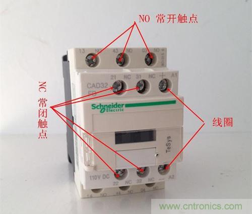 上圖是接觸器,繼電器與之相比較小,但原理相同。共有兩排共12個接線柱(2個接線柱,一進一出算1組)。最上面一排接線柱中,有2組常閉觸點,和1組線圈觸點,下面一排有3組常開觸點。