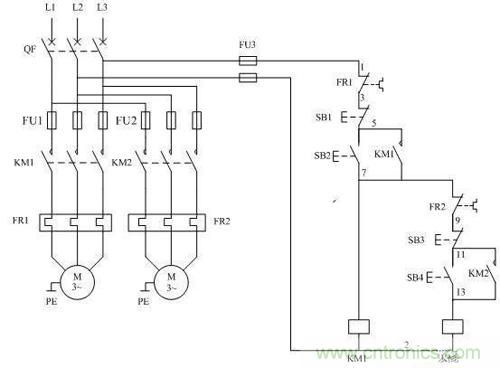 若需要其它電機在M1啟動后才能啟動,則把該電機的控制回路與M2的控制回路并聯。