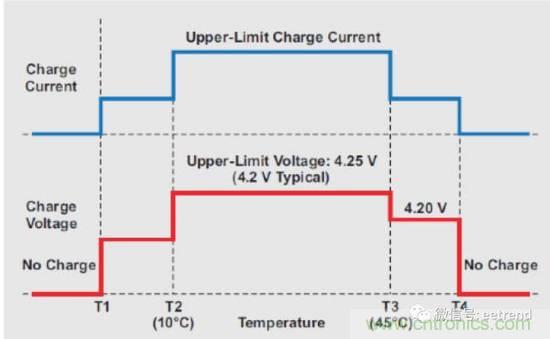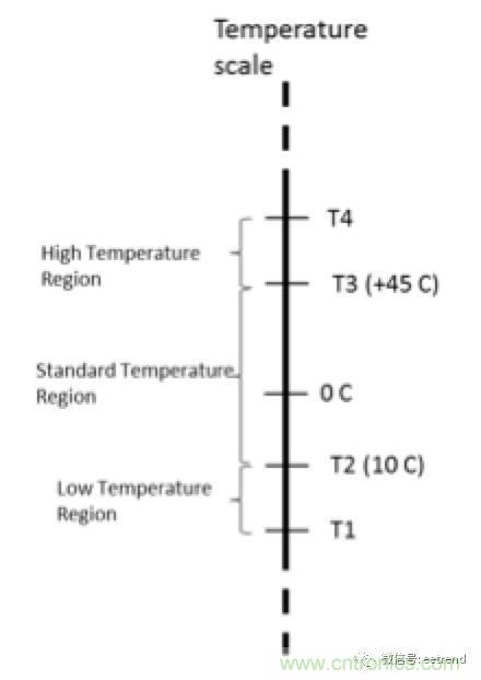 如圖1所示,JEITA規(guī)范定義了最低溫度(T1)、最高溫度(T4)和位于二者之間的三個(gè)溫度區(qū)(低、中、高),以確保充電安全。