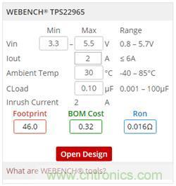 負載開關WEBENCH功能可通過產品頁面右側的WEBENCH組件實現。圖2顯示了TPS22965負載開關的組件。