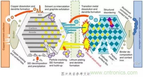 下面我們就來了解以下,為什么鋰離子電池在使用的過程中,會發生衰降呢?首先我們必須清楚,在鋰離子電池的內部,除了正常的鋰離子嵌入和脫嵌正負極的反應,還會存在很多副反應,例如SEI膜的生成和生長,電解液分解,粘結劑分解,正負極活性物質破裂等等因素,都會造成鋰離子電池的容量下降。雖然造成鋰離子電池衰降的因素很多,但是歸結起來可以分為三個大類:1)鋰損失,由于鋰離子電池是一個封閉系統,內部的物質是恒定的,SEI膜的生成、破壞,負極析鋰等都會消耗僅有的Li資源;2)正極活性物質損失,在鋰離子電池使用的過程中往往會發生正極材料顆粒破碎,粘結劑分解和正極材料晶體結構改變等因素,這些都會導致一部分正極活性物質失去嵌鋰等能力;3)負極活性物質損失,例如負極活性物質脫落,粘結劑分解等因素,都會導致部分負極活性物質顆粒失去與導電網絡的導電連接,從而使其無法嵌鋰,造成鋰離子電池容量損失。