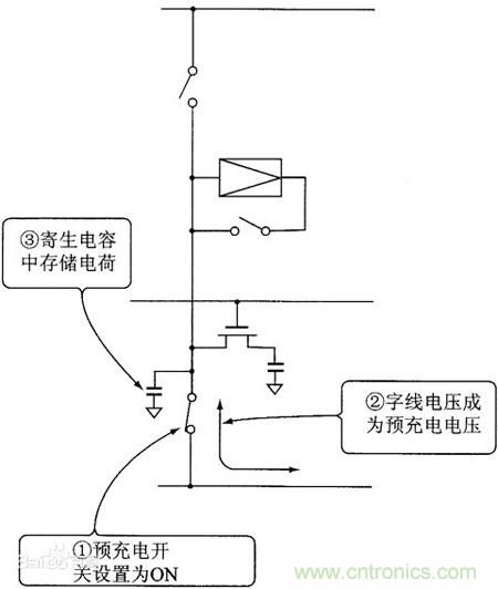 寫操作時(shí),寫選擇線為“1”,所以Q1導(dǎo)通,要寫入的數(shù)據(jù)通過Q1送到Q2的柵極,并通過柵極電容在一定時(shí)間內(nèi)保持信息。