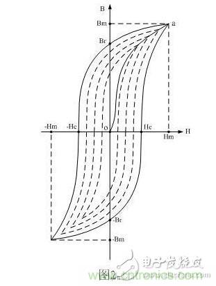 從圖2-16可以看出,當變壓器鐵芯中不存在磁化場時,H和B均為零,即圖2-16中B~H曲線的坐標原點0。隨著磁場強度H的增加,磁通密度B也隨之增加,但兩者之間不是線性關(guān)系。當H增加到一定值時,B不再增加(或增加十分緩慢),這說明該變壓器鐵芯的磁化已接近飽和狀態(tài)。一般人們都把Hm和Bm分別稱為最大磁場強度和最大磁通密度(對應(yīng)于圖中a點);而把Hs和Bs分別稱為飽和磁場強度和磁通密度。
