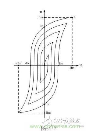 如果再使H逐漸退到零,則與此同時B也逐漸減少。然而H和B對應(yīng)的曲線軌跡并不沿原曲線軌跡a-0返回,而是沿另一曲線下降到Br,這說明當H下降為零時,鐵磁物質(zhì)中仍保留一定的磁性,這種現(xiàn)象稱為磁滯,Br稱為剩磁。將磁場反向,再逐漸增加其強度,直到H=-Hc,磁通密度消失,這說明要消除剩磁,必須施加反向磁場Hc。Hc稱為矯頑力。它的大小反映鐵磁材料保持剩磁狀態(tài)的能力。圖2-16表明,當磁場按Hm→0→-Hc→-Hm→0→Hc→Hm次序變化時,B所經(jīng)歷的相應(yīng)變化為Bm→Br→0→-Bm→-Br→0→Bm。于是得到一條閉合的B~H曲線,稱為磁滯回線。所以,當鐵磁材料處于交變磁場中時(如變壓器中的鐵芯),它將沿磁滯回線反復被磁化→去磁→反向磁化→反向去磁。在此過程中要消耗額外的能量,并以熱的形式從鐵磁材料中釋放,這種損耗稱為磁滯損耗。前面已經(jīng)證明,磁滯損耗與磁滯回線所圍面積成正比。
