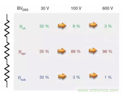 圖2顯示平面式MOSFET情況下構成RDS(on) 的各個分量。對于低壓MOSFET,三個分量是相似的。但隨著額定電壓增加,外延層需要更厚和更輕摻雜,以阻斷高壓。額定電壓每增加一倍,維持相同的RDS(on)所需的面積就增加為原來的五倍以上。對于額定電壓為600V的MOSFET,超過95%的電阻來自外延層。顯然,要想顯著減小RDS(on)的值,就需要找到一種對漂移區進行重摻雜的方法,并大幅減小epi電阻。