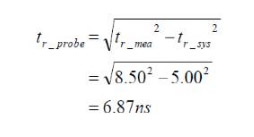 如圖3.1所示,根據示波器測量到的上升時間為8.5ns,這個總時間是信號發生器自身的上升時間加上探頭的上升時間,所以實際上探頭的上升時間還需要將總時間減去信號發生器自身的上升時間,具體的計算公式如下。