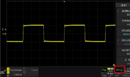 如圖3所示,在測試1KHz的電流方波時,探頭的方波響應是很好的,波形基本上沒有畸變,波形比較平坦,沒有發生傾斜等。