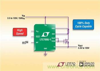 LTC7000是一款快速、高壓側 N 溝道 MOSFET 柵極驅動器,主要接收一個參考于地的低電壓數字輸入信號,并以 35ns 的傳播延遲完全接通或關斷一個其漏極可高出地電位達 135V 的高壓側 N 溝道 MOSFET。13ns的快速上升和下降時間 (當驅動一個 1000pF 負載) 最大限度降低了開關損耗。其內部充電泵全面強化一個外部 N 溝道 MOSFET 開關,因而使之能無限期地保持導通。