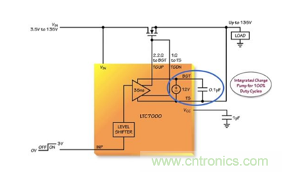 位于 BOOST 和 TS 引腳之間的浮動電源在內部調節至 12V,從而降低了由外部 MOSFET 之導通電阻引起的功率損耗。而強大的輸出器件把外部 MOSFET 保持在由低電壓 INP 信號控制的狀態中,即使在高電壓和高頻瞬變從功率 MOSFET 反饋耦合至驅動電路的情況下也不例外。