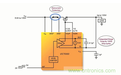 LTC7000 在 INP 引腳上接收一個參考于地的低電壓數字信號、把該信號電平移位至高達 VIN 電壓。并控制片內低阻抗上拉和下拉器件,能快速接通或判斷一個其漏極可高出地電位達 135V 的高壓側 N 溝道 MOSFET。從低電壓 INP 信號至得到全面強化或被完全關斷的 N 溝道 MOSFET 之傳播延遲約為 35ns,這也促成了許多應用。
