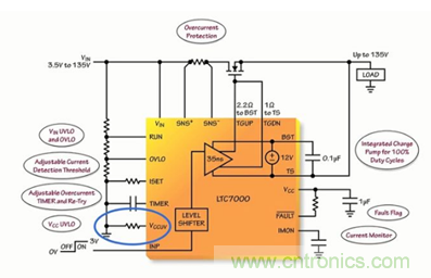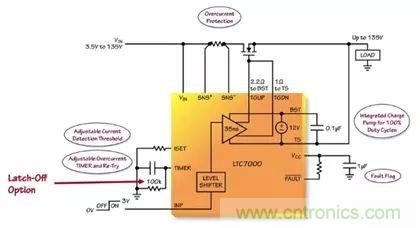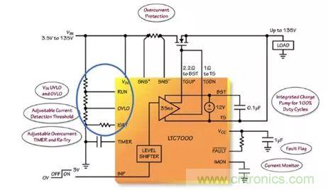 LTC7000 能夠避免負載遭受 VIN 引腳上的過壓和欠壓情況的損壞。“一個連接在 VIN 和地之間、且抽頭連接至 RUN 和 OVLO 引腳的簡單電阻分壓器將設定一個針對負載的有效操作窗口。當 VIN 位于由 RUN 和 OVLO 引腳所設定的操作窗口之外時,則關斷外部 MOSFET,并保護負載免遭潛在損壞或發生故障。” Mark Mullen這樣談到。