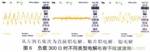 圖6 所示為負載是300 Ω 時不同類型電解電容下所測量到的紋波波形,可以明顯看出使用貼片鋁電解紋波最小,使用普通鋁電解紋波較大且紋波具有毛刺,使用貼片鉭電解紋波有所減小且毛刺也有很大程度的改善。