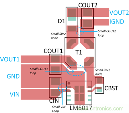 圖 3.基于 LM5017 的 Fly-Buck 布局可對 di/dt 環(huán)路和高 di/dt SW1,2 節(jié)點面積進行最小化。