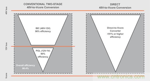圖字:12V總線;48V總線;傳統的兩級48V至Vcore轉換;IBC(48V-12V);96%效率;POL(12V-1V);90%效率;總效率為86.4%;直接48V至Vcore轉換;直接至Vcore轉換器;>91%或更高的效率