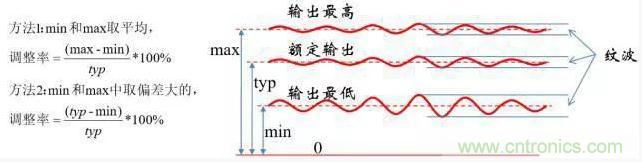 ■注意區(qū)分調(diào)整率和紋波,紋波是輸出的動態(tài)特征,而調(diào)整率是讓電源 工作在極限外部條件下,輸出的極限偏差。