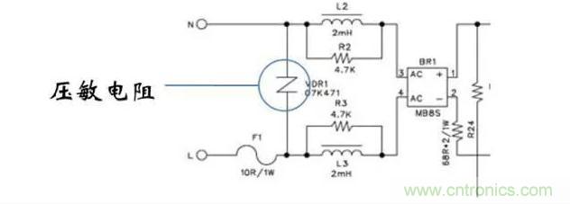 ■大功率設(shè)備斷開或接入電網(wǎng)時,會使得電網(wǎng)電壓上升或跌落。為了保 護電源,有時會使用一個壓敏電阻接在輸入端。