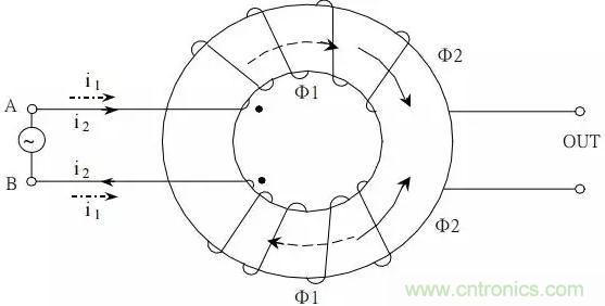 在開關(guān)電源中,由于整流二極管和濾波電容以及電感中的電流或電壓急劇變化,產(chǎn)生電磁干擾源(noise),同時(shí)輸入電源中也存在工頻以外的高次諧波噪聲,這些干擾若不加以扼制,將對(duì)負(fù)載設(shè)備或開關(guān)電源本身造成損害,因此若干國(guó)家之安規(guī)機(jī)構(gòu)對(duì)電磁干擾(EMI)發(fā)射量均作出了相應(yīng)的管制規(guī)定。當(dāng)前開關(guān)電源的開關(guān)頻率日趨高頻化EMI也隨之日益嚴(yán)重,所以開關(guān)電源中均須設(shè)置EMI濾波器,EMI濾波器需對(duì)常模及共模噪聲均作出相應(yīng)的抑制,以達(dá)到某一規(guī)定標(biāo)準(zhǔn)。常模濾波器負(fù)責(zé)濾出輸入或輸出端兩根線間之差模干擾信號(hào),共模濾波器負(fù)責(zé)濾出兩條入線之共模干擾信號(hào)。實(shí)際共模電感因其工作環(huán)境不同,又可分為AC CM.M.CHOKE;DC CM.M.CHOKE和SIGNAL CM.M.CHOKE三種,在設(shè)計(jì)或選用時(shí)應(yīng)于以區(qū)分。但其工作原理完全相同,工作原理如圖(1)所示:
