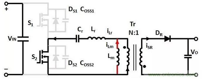 T4時刻,同時關斷SR和S2,(Coss1+Coss2)和(Lr+Lm)諧振,Coss1放電,Coss2充電,直到T5時刻,Coss2的電壓充電到VIN,Coss1的電壓放電到0。
