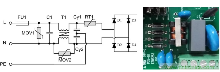 背景:以某型號的電源模塊為例,該模塊是ZLG致遠電子為某客戶定制的電源模塊,輸入85VAC~350VAC,且EMC前級電路電路嵌入到模塊中。抗浪涌要求差模電壓3KV,共模電壓6KV。更換更大的保險絲后可承受6KV差模電壓。其前級原理圖及對應實物圖如圖2所示。
