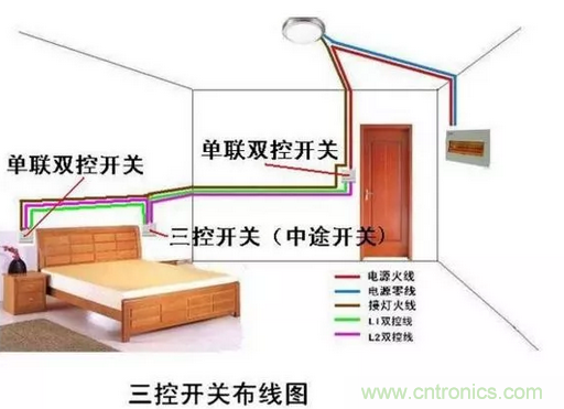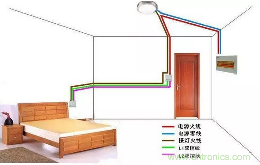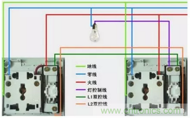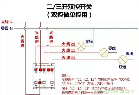 有的朋友說中間可不可以用雙聯雙控開關,也是可以的。不過雙聯開關上有兩個開關,需用同時按下。