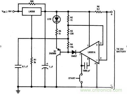 對(duì)于膠體電介質(zhì)鉛酸蓄電池來(lái)說(shuō),該電路是一個(gè)高性能的充電器。該充電器能夠迅速地為電池充電,且當(dāng)電池充滿時(shí),它可迅速地?cái)嚅_充電。最開始的充電電流限制在2A。隨著電池電流和電壓的增加,當(dāng)電流增加到150mA時(shí),充電器就會(huì)調(diào)整至較低的漂浮電壓,以防止過(guò)度充電。