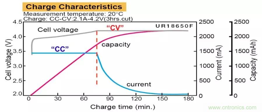 使用類似BQ4725A這類集成的充電管理芯片方案對鋰電池充電其實十分簡單。鋰電池直接連接到充電控制芯片BQ24725A的BAT管腳上,配置充電控制芯片的Charge Voltge,Charge Current,以及保護功能的Input Current Limit,使能充電功能即可。Charge Voltage(VCHG)是電芯的最大滿充電壓,Charge Current (ICHG) 是電芯允許的最大充電電流。典型的鋰電池充電特性如下圖所示,分為CC(Constant current)和CV(Constant Voltage) 兩個階段。CC階段恒定以最大充電電流持續對電池進行充電,此時單位時間充入電池的電量是恒定的Q=ICHG*T。隨著電池充入電量越來越多,電池電壓會上升,當電壓上升到最大滿充電壓時候,充電芯片將控制輸出電壓為恒定的最大滿充電壓,此時電流開始逐漸減小,充入電量的增加速度慢慢減慢,總充入電量仍然在增加。直到電流減小到截止電流點,充電芯片停止充電,鋰電池達到充滿狀態。