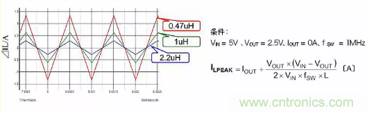 在這里,為加深對(duì)電感工作的理解,進(jìn)一步說明電感值變化時(shí)電感電流如何變化的情形。下圖表示在相同工作條件下將電感值設(shè)為0.4μH、1μH、2.2μH時(shí)ILPEAK。