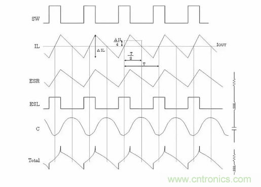 通過開關(guān)所產(chǎn)生的電感電流紋波ΔIL將產(chǎn)生與ESR成單純正比的紋波電壓,有些ESL則會(huì)產(chǎn)生方形波電壓,與電容值部分合成,最下方波形成為最終的輸出紋波電壓波形。
