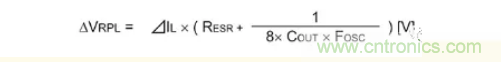 以下是表示輸出紋波電壓的公式。電容器的紋波電壓和ESR的紋波由于相位偏離,故無(wú)法進(jìn)行單純的加算,不過卻是紋波電壓的最差值概算常用的公式。