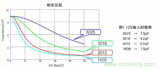 關(guān)于DC偏置,當(dāng)然須選擇影響少的,不過即使電容值、耐壓相同,變動(dòng)特性也會(huì)因封裝尺寸而異。下方圖表為其一例,顯示尺寸大者變動(dòng)少。總之,請(qǐng)務(wù)必從電容器廠商取得充分的信息。