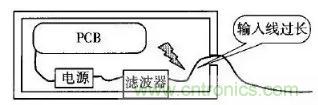 許多設(shè)備的電源線進(jìn)入機(jī)箱后,經(jīng)過(guò)很長(zhǎng)的導(dǎo)線才接到濾波器的輸入端。例如,電源線從機(jī)箱后面板輸入,走行到前面板的電源開(kāi)關(guān),又回到后面板接到濾波器。或者濾波器的安裝位置距離電源線入口較遠(yuǎn),造成引線太長(zhǎng)(如圖1所示)。