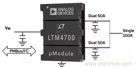 圖1:LTM4700雙50A或單100AμModule®穩壓器