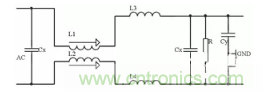圖4是220V/50Hz交流輸入的開關電源交流側EMI濾波器的電路。Cy=3300pF,L1、L2=0.7mH,它們構成共模濾波電路,抑制0.5~30MHz的共模干擾信號。Cx=0.1μF,L3、L4=200~500μH,采用金屬粉壓磁芯,與L1/L2、Cx構成L-N端口間低通濾波器,用于抑制電源線上存在的0.15~ 0.5MHz差模干擾信號。R用于消除可能在濾波器中出現的靜電積累。