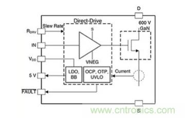 eGaN 價格降低使芯片制造商能夠解決這兩個問題。例如,Texas Instruments 在其 LMG3411R070 的集成柵極驅動中集成了70 毫歐姆 (mΩ)、600 伏 eGaN 功率級(圖 2)。