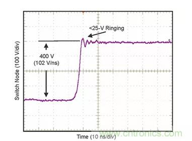 該芯片的壓擺率可達 100 伏/納秒 (ns) 且瞬時振蕩近乎為零(圖 3)。相比之下,傳統硅功率 MOSFET 的壓擺率典型值為 3 至10 V/ns。