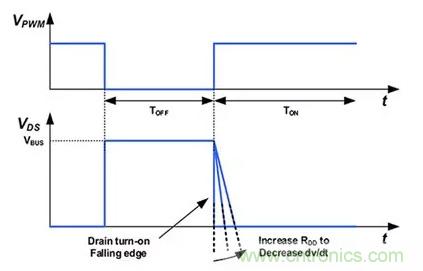 圖6:RDD 電阻器的大小決定了 NV6113 導通電流和功率 FET 漏極的導通(下降)沿壓擺率。(圖片來源:Navitas Semiconductor)