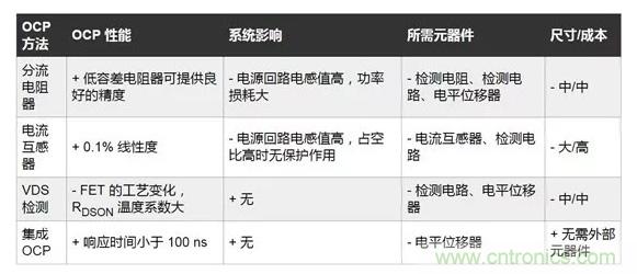 一種傳統的 OCP 方法是使用電流互感器、分流電阻器或去飽和檢測電路(如下表)。然而,這會增大電源回路的寄生電感和電阻,反而需要降低壓擺率,且導致功率耗散升高,從而對系統性能產生不利影響。此外,互感器或分流電阻器等分立器件會增加成本,占用電路板空間。