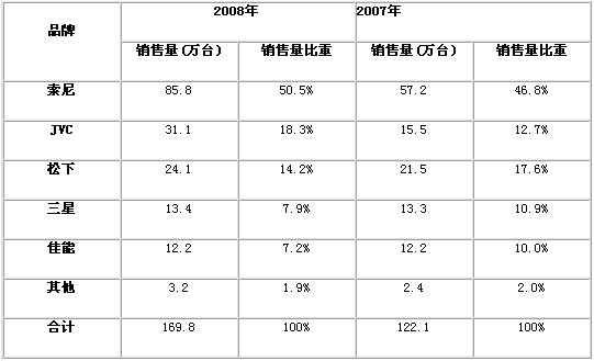 表2 2007-2008年中國數(shù)碼攝像機市場品牌銷售量結(jié)構(gòu)