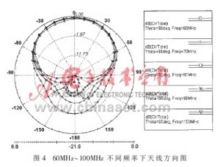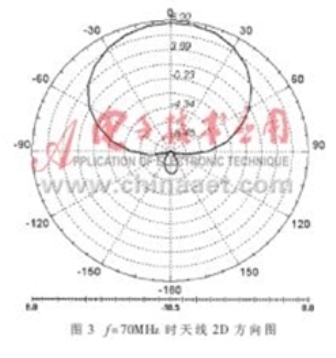 圖3為f=70MHz時天線的二維方向圖,從中可以看出,天線方向性系數(shù)達到7dB左右,而利用文獻中的圖表所查到方向性系數(shù)為6.5dB。圖4給出了幾個頻率下天線的二維方向圖,可以看出,各個頻率下方向圖形狀大致相同,但隨著頻率越靠近頻率范圍的上下限、方向圖背瓣越大。