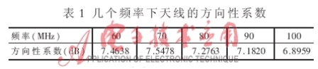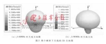 為了更形象地描述天線的方向性,軟件可以給出三維方向圖。頻率為60MHz和90MHz時天線的三維方向圖如圖5所示。表1給出天線的方向性系數(shù) 。